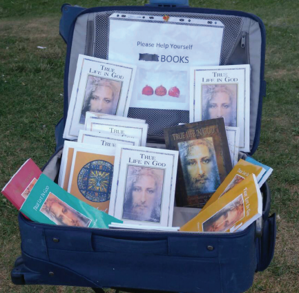 Quise compartir esto porque es bien efectivo. Hay días en que se llevan 15 libros; otros, en que no se llevan ninguno. Hoy puse 23 libros o librillos de La Verdadera Vida en Dios y luego de 2 horas quedaban 15. Dejé la mesa y el maletín atados al poste de la luz y me fui a caminar por el paseo tablado pero me quedé cerca de los libros. Volví y me di cuenta de que nadie había tocado los libros, y me senté entonces en una banca, cerca de los libros, por media hora.
