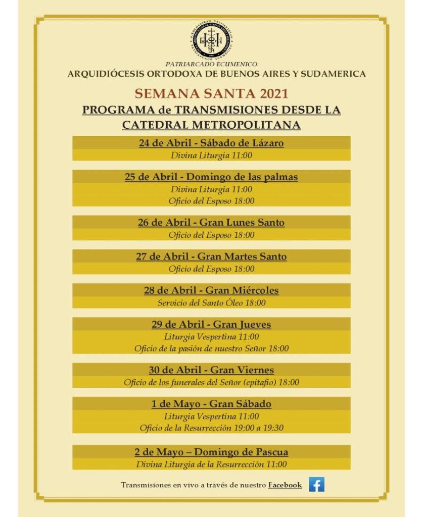 Adjuntamos el programa de la Semana Santa de la Catedral Ortodoxa Griega. Gracias a que este año se transmitirá también por medios digitales, podrán conocer la rica liturgia de Oriente los que aún no han tenido ocasión, tal vez porque no tienen un templo ortodoxo en su ciudad; y a través del conocimiento crecer en la valoración y el amor hacia esta Tradición.