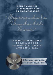 Con gran alegría invitamos a todos a participar del próximo retiro anual de la Verdadera Vida en Dios – Argentina, que se desarrollará el próximo sábado 14 de octubre de 2023 en la Posada del Orante (Arcos 2971 – CABA), en forma presencial de 10 a 18 hs