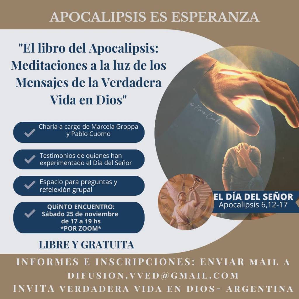 En este encuentro Pablo Cuomo y Marcela Groppa meditarán sobre el final del capítulo 6 del libro del Apocalipsis y algunos lectores que han experimentado la Visita del Señor nos compartirán su testimonio y el camino de conversión que iniciaron luego de ese llamado a aprender por gracia a conversar con Dios y evangelizar con amor por el Amor.