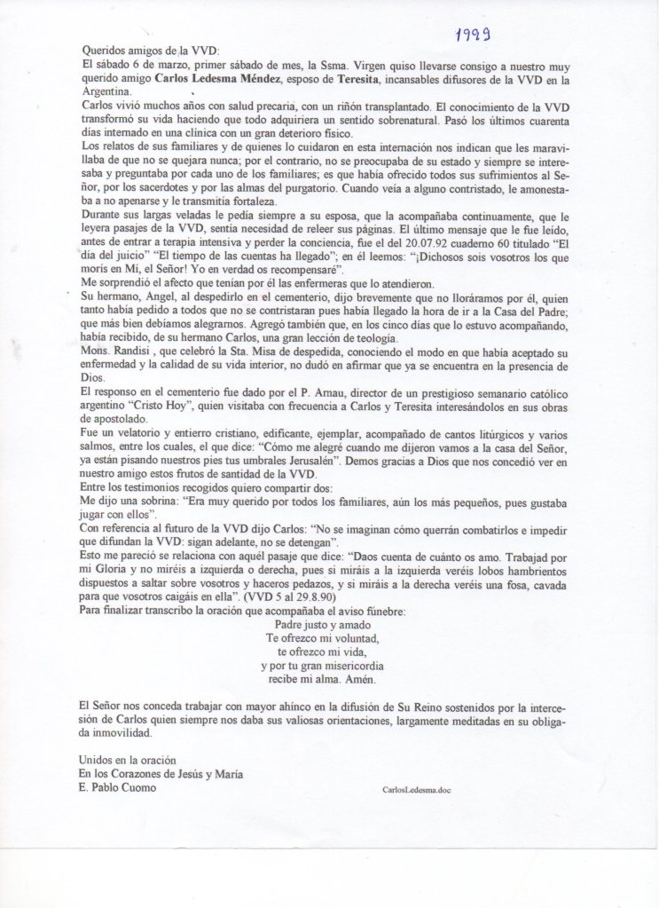 Junto a su esposa Teresita Infante fueron los que introdujeron la Verdadera Vida en Dios en Argentina y difundieron los Mensajes del Señor.