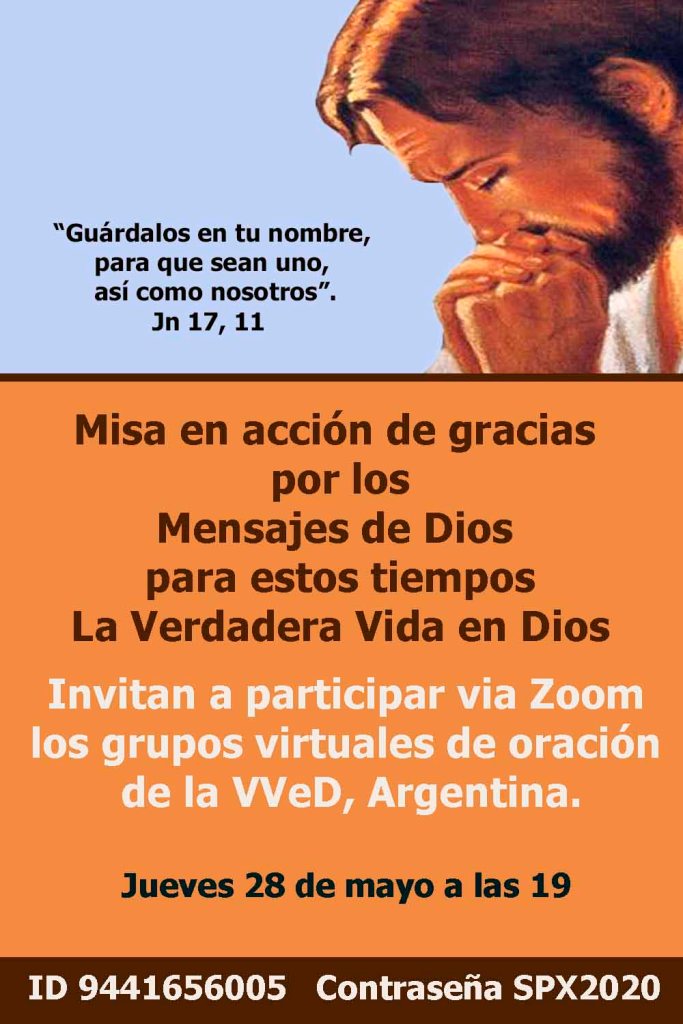 “Me han quedado varias cosas de la VVeD que se entrelazan con el Evangelio, que es cuando Jesús le exhorta, no le ordena, porque lo que hace Vassula es entregarse. Y hoy me pasó algo con respecto a eso. Hubo una situación de una necesidad y la persona que se había comprometido se echó atrás y pensé, qué haría Jesús en mi lugar, y la perdoné. En esta pandemia, las familias o se unen estrechamente o se desparraman. Nosotros estamos tratando permanentemente de estar unidos, de azuzarnos, entonces fui a buscar la comunión, para mi familia en la comunión espiritual de la Misa, entonces dije: que más quiero, lo otro es cháchara. Y hoy me llamó esa persona y me dijo que se arrepintió”. (Pedro, CABA)