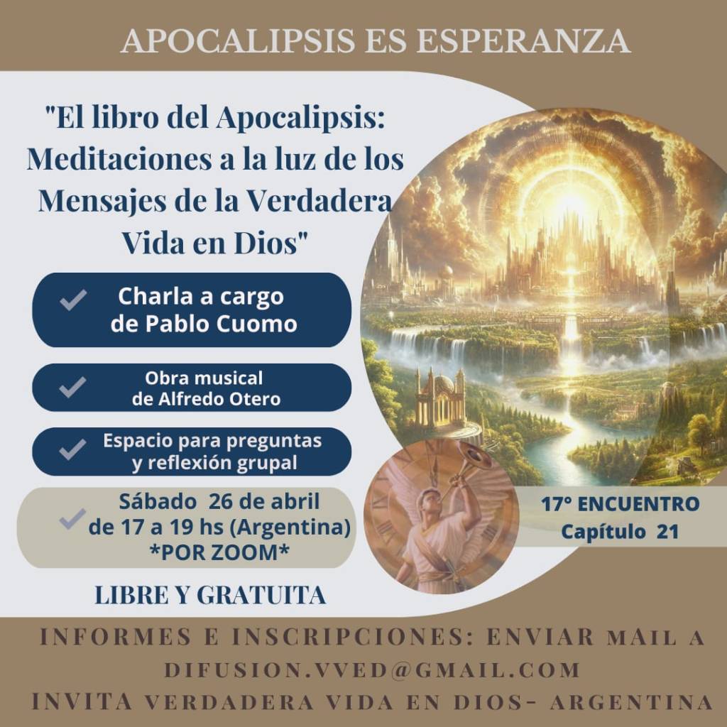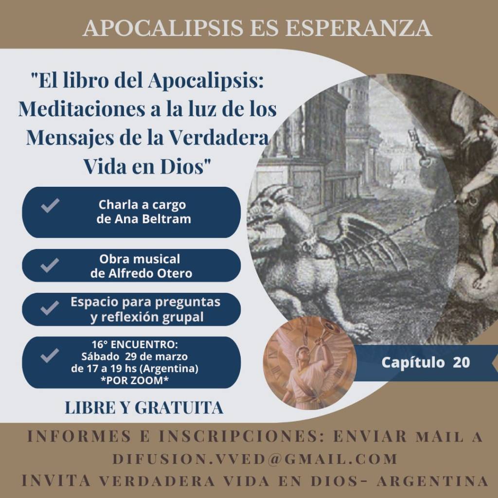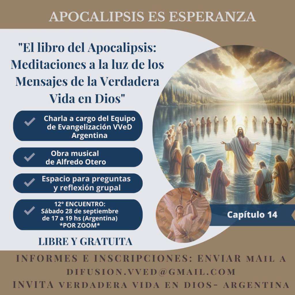 El próximo encuentro, -ya el número 12-, será el sábado 28 de septiembre a las 17 hora de Argentina. A los interesados en participar se les recomienda leer el capítulo 14 del libro del Apocalipsis.