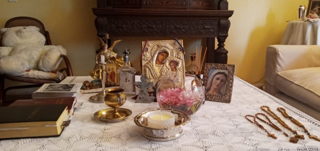 El sábado 11 de febrero, nos encontramos a rezar el rosario por la unificación de las fechas de Pascua en la casa de la familia ortodoxa que nos recibe los segundos sábados de cada mes. Lo hace desde mas de 20 años atrás. Rezamos todos alrededor de un ícono de la Theotokos.